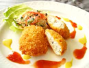 新発売のベジカキフライです!動物性素材を使わずに豆腐と舞茸、アオサを使って独特の風味を出しました。冷凍のまま180℃の油に入れて、約3分間揚げてお召し上がりください。お好みでタルタルソースやレモンをかけてください。
