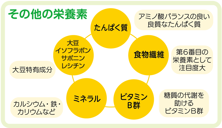 大豆の栄養素は世界中で注目されています。話題の大豆イソフラボン、レシチン、サポニン、たんぱく質などが含まれていて、美容や健康維持によい働きをすることで知られています。厚生労働省は国民の健康づくり対策「健康日本21」を執行し、1日100g以上の豆類を摂取することを推奨しています。